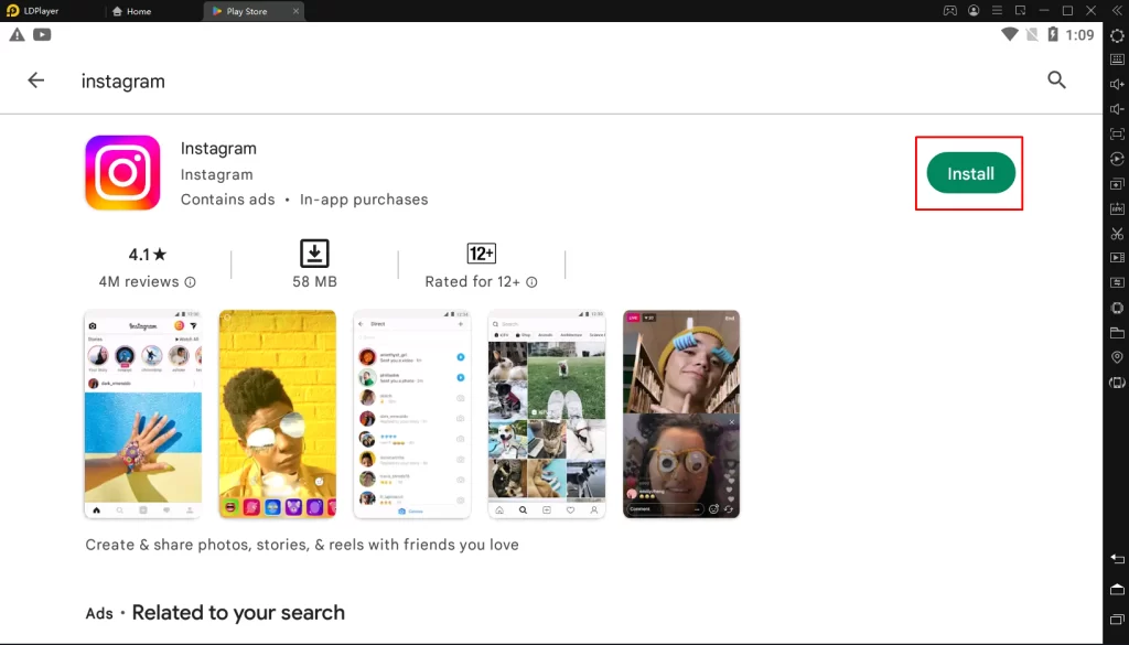 - In PlayStore, click the search bar, type Instagram and click the install button.